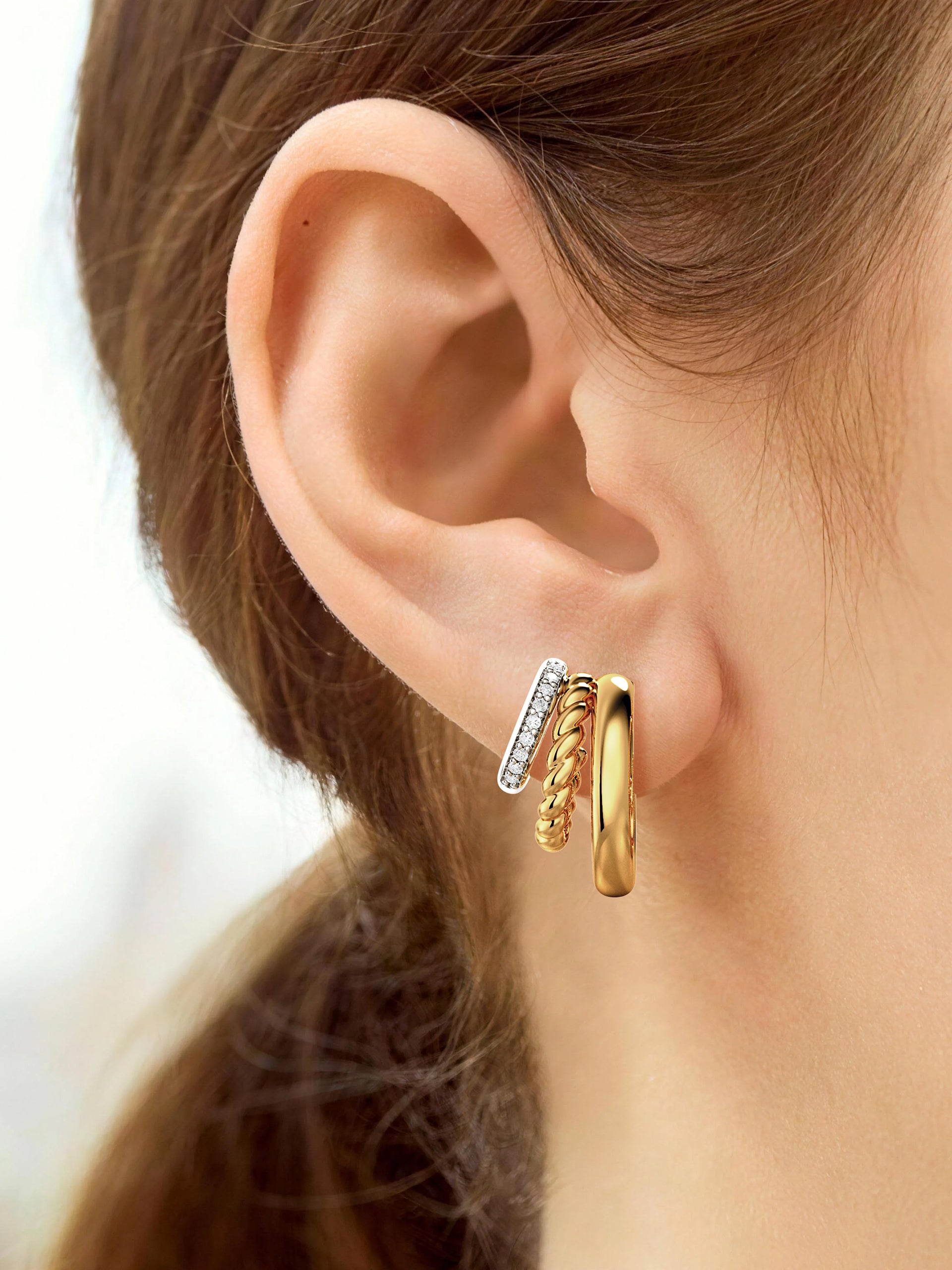 Three interlocking loops in mixed metal tones with subtle sparkle accents. Bold yet wearable, ideal for layered everyday styling.