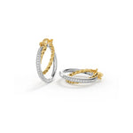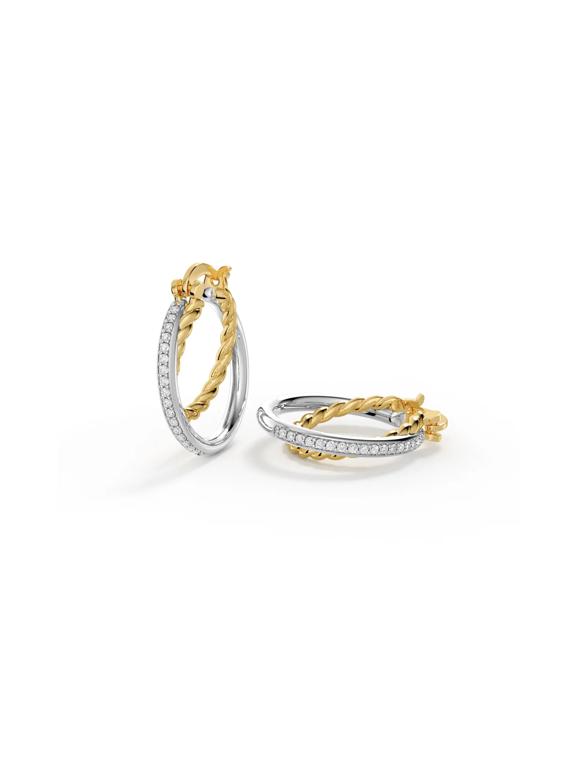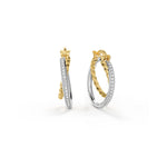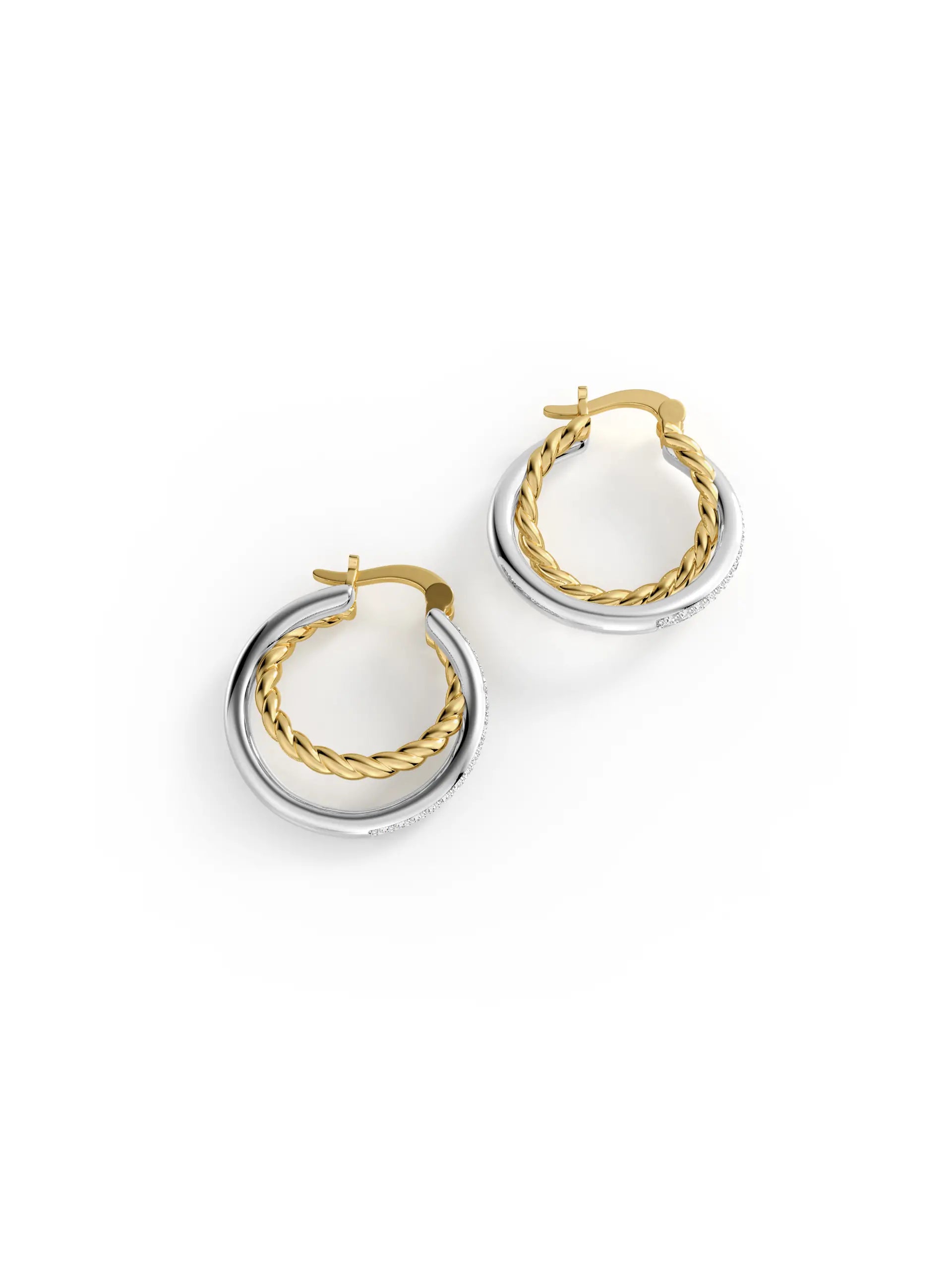 Interwoven double hoops in mixed metal tones with textured detailing and luminous edges. A modern take on vintage-inspired style.