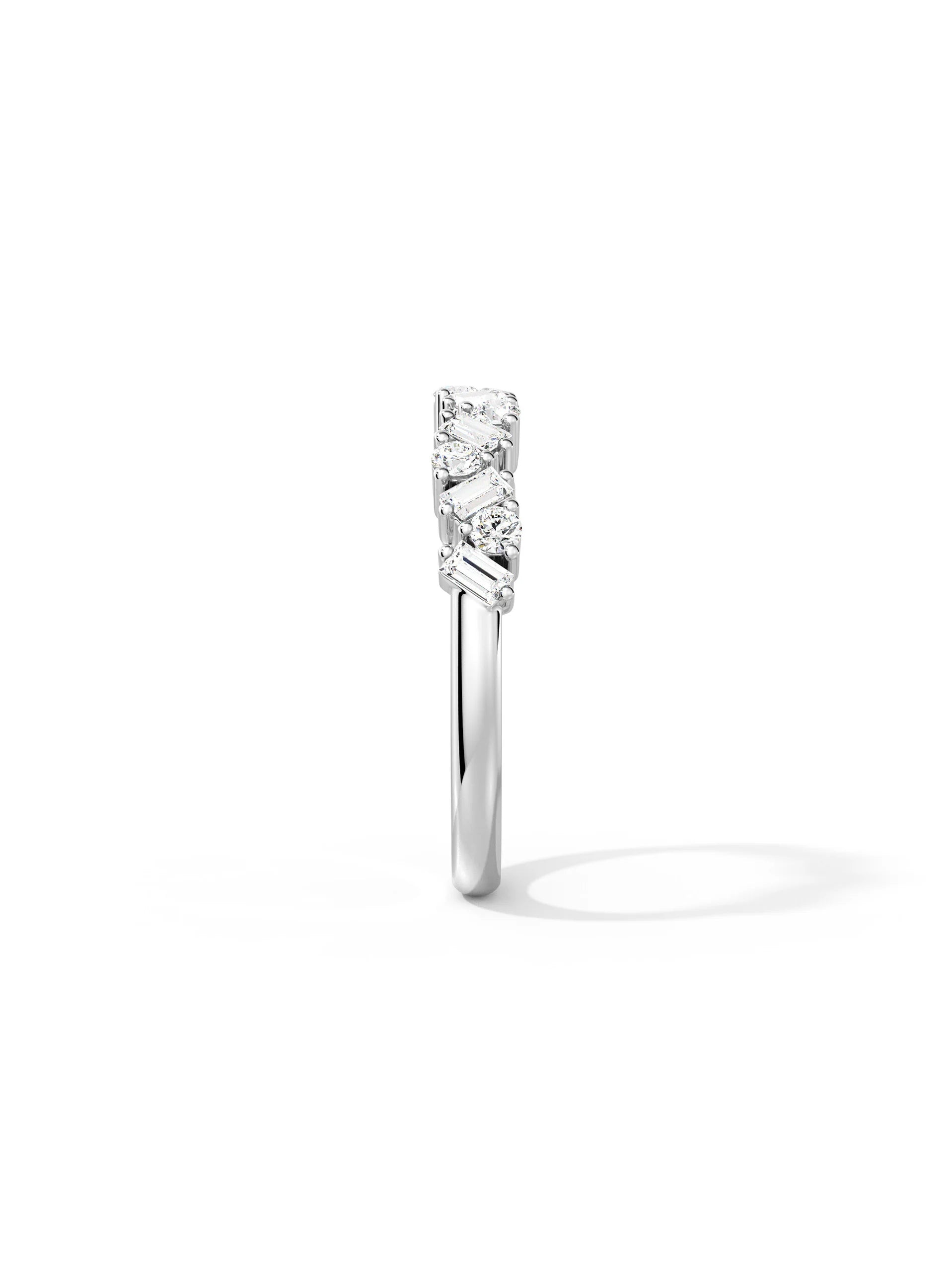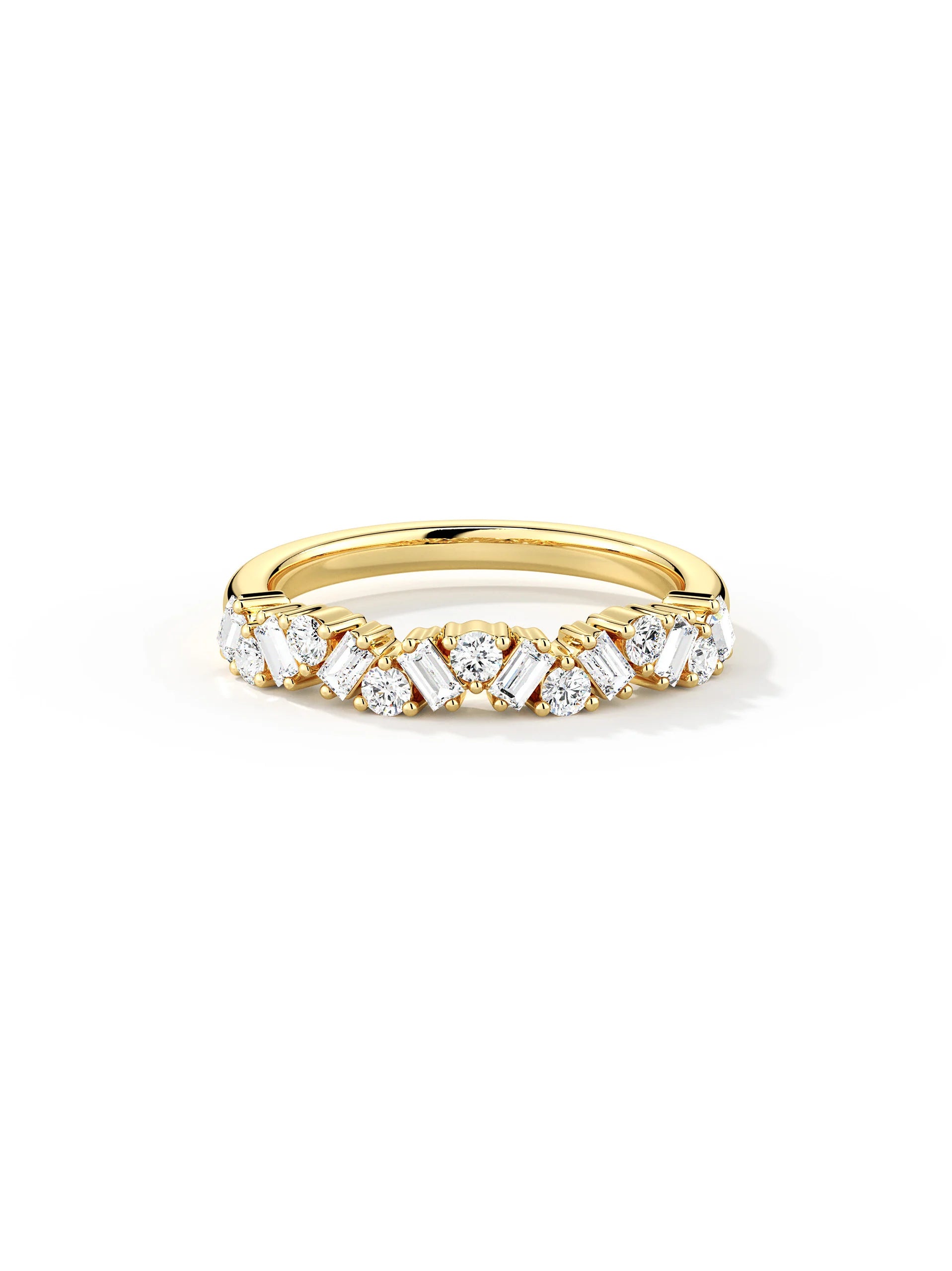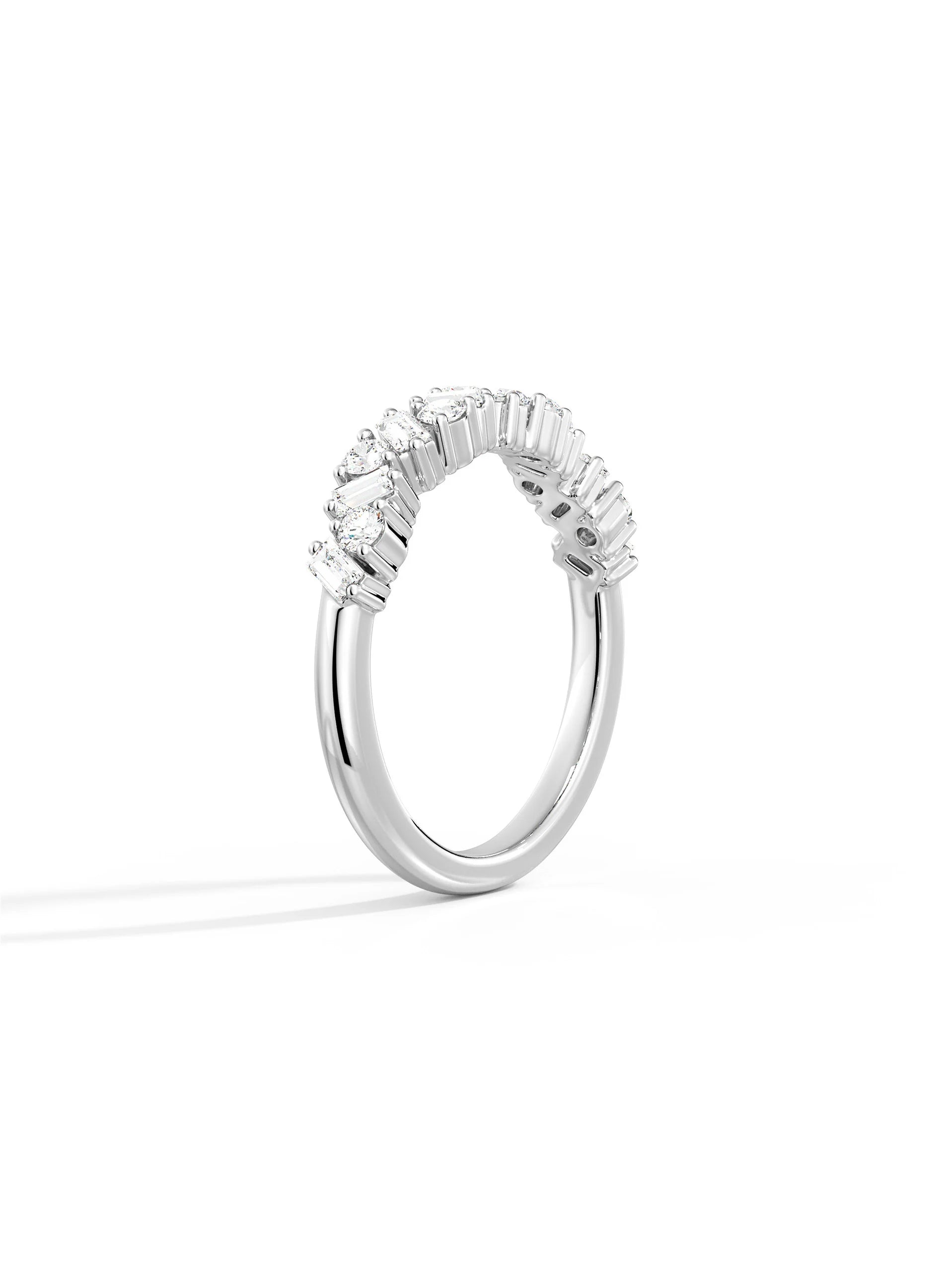 Mixed-cut moissanite arranged in a layered, modern silhouette. Unique yet wearable — ideal for stacking or standout everyday looks.