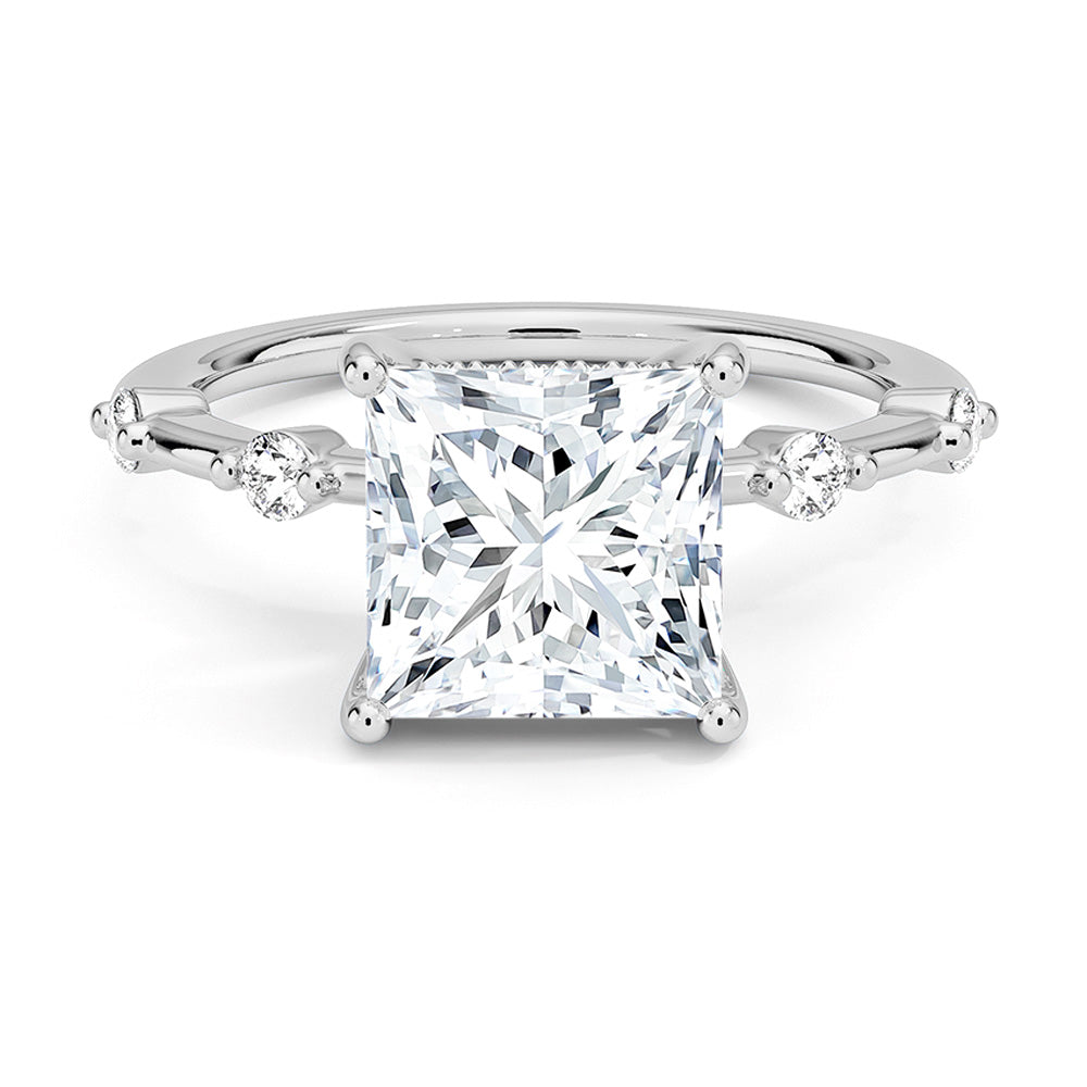 A perfect blend of elegance and modern design, this Princess Cut Moissanite Ring features a stunning center stone, highlighted by a hidden halo that enhances its natural brilliance. The diamond-spaced band adds extra sparkle and sophistication, creating a refined, luxurious look from every angle.