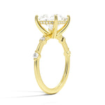 Moissanite, celebrated for its exceptional fire and ethical origins, serves as a brilliant, ethical alternative to diamonds. The hidden halo setting provides a seamless, elegant touch, while the spaced diamonds on the band elevate the overall design. This ring is the ideal choice for anyone looking to symbolize their lasting commitment with timeless beauty.