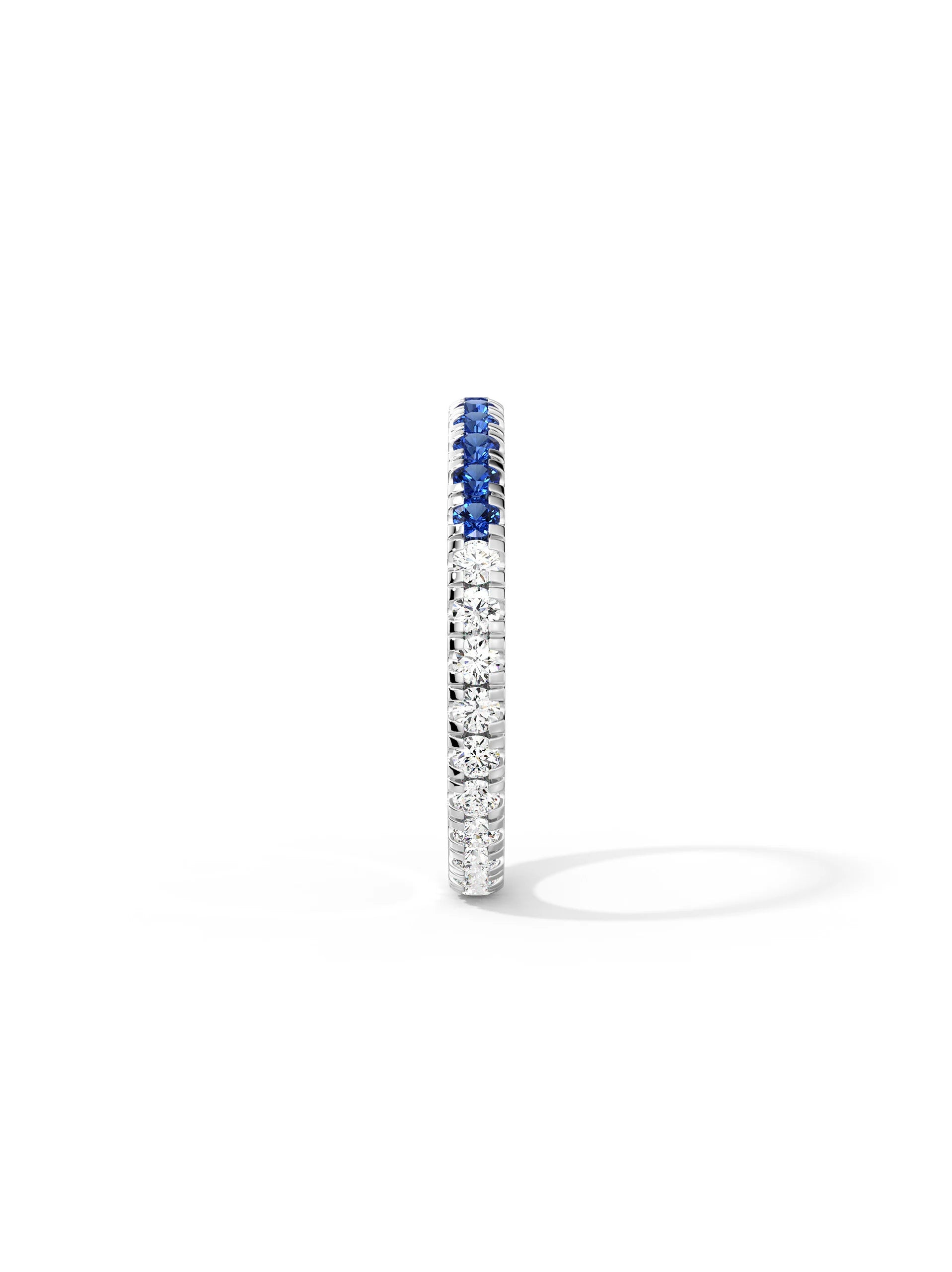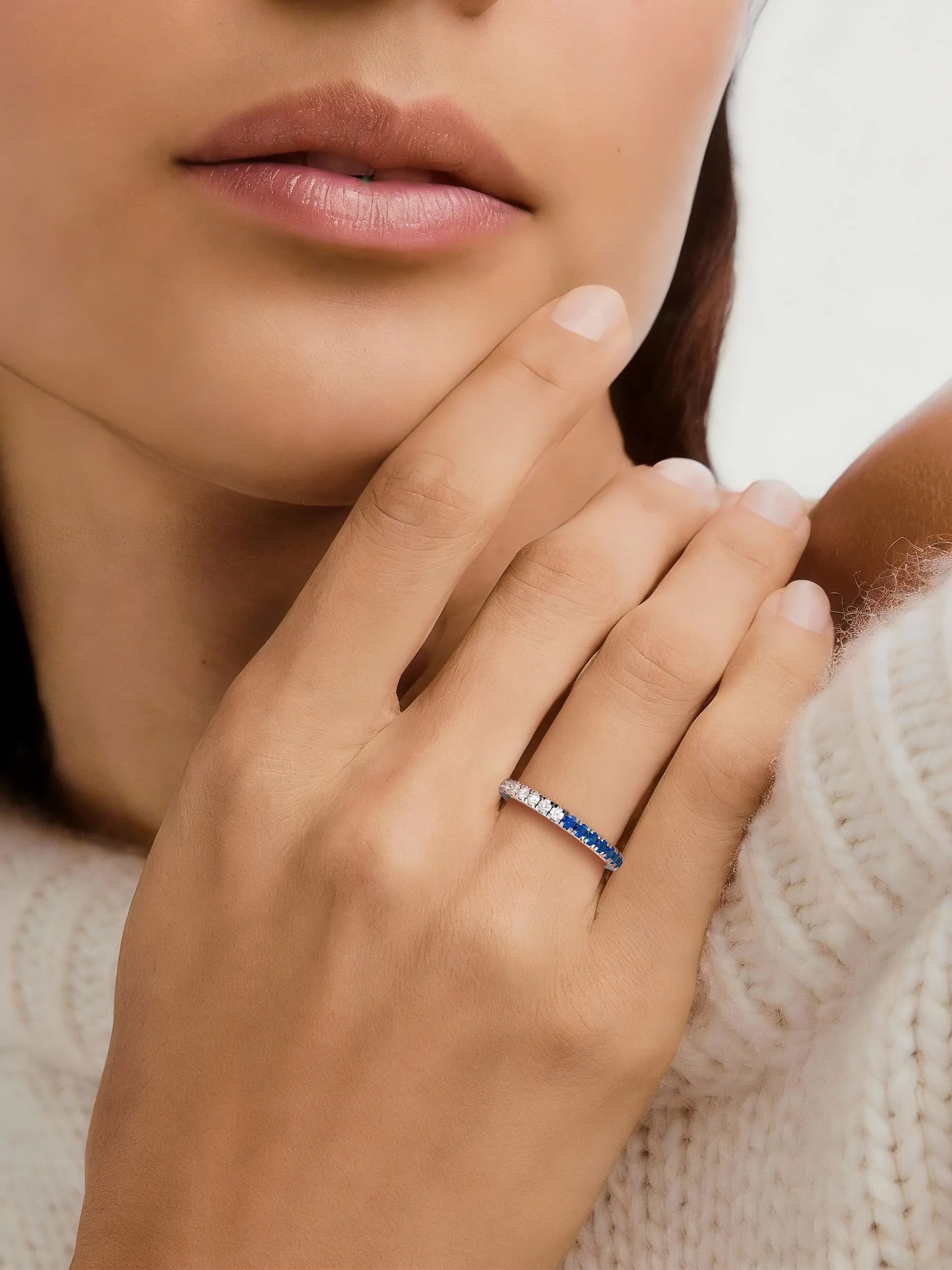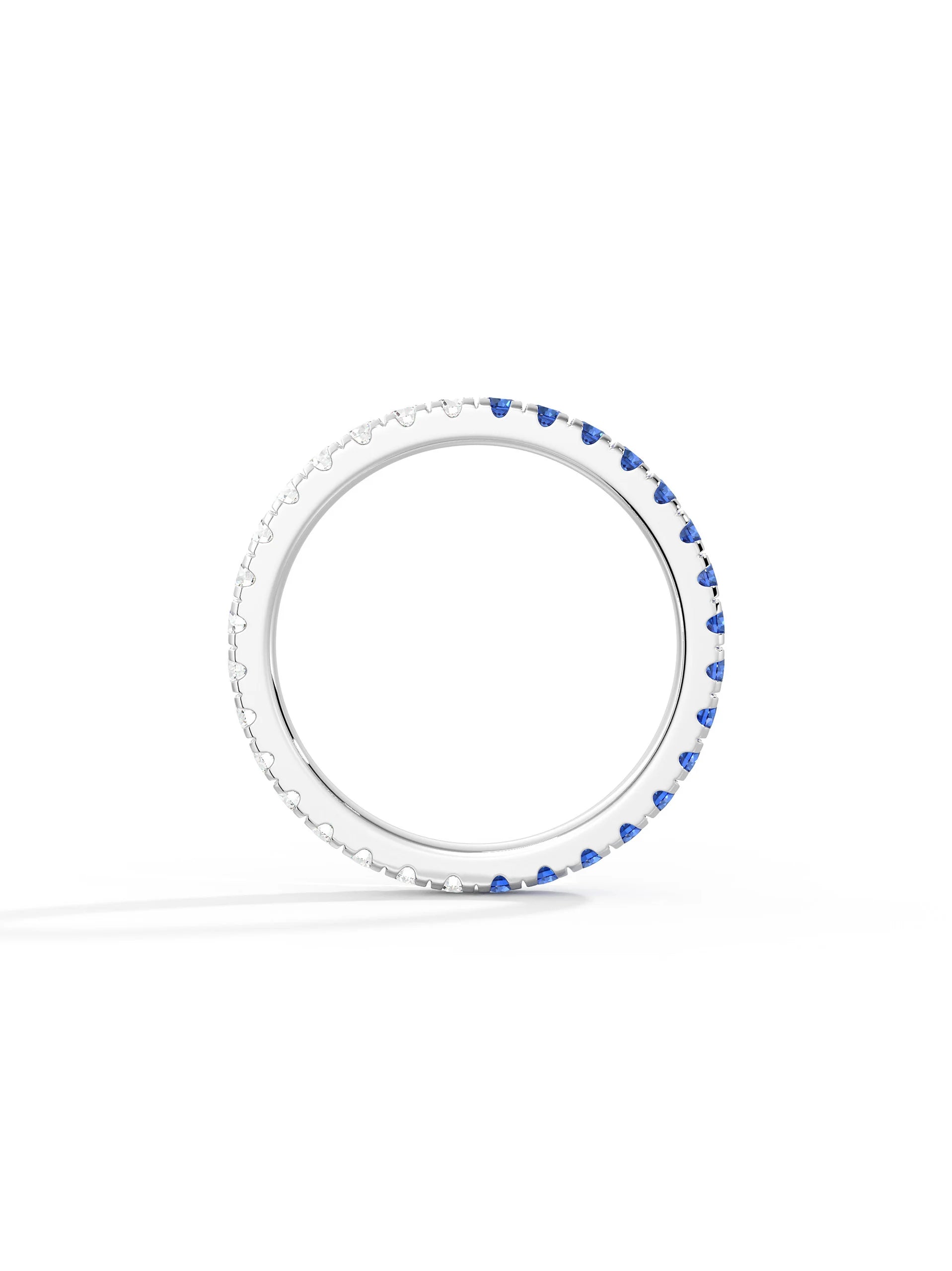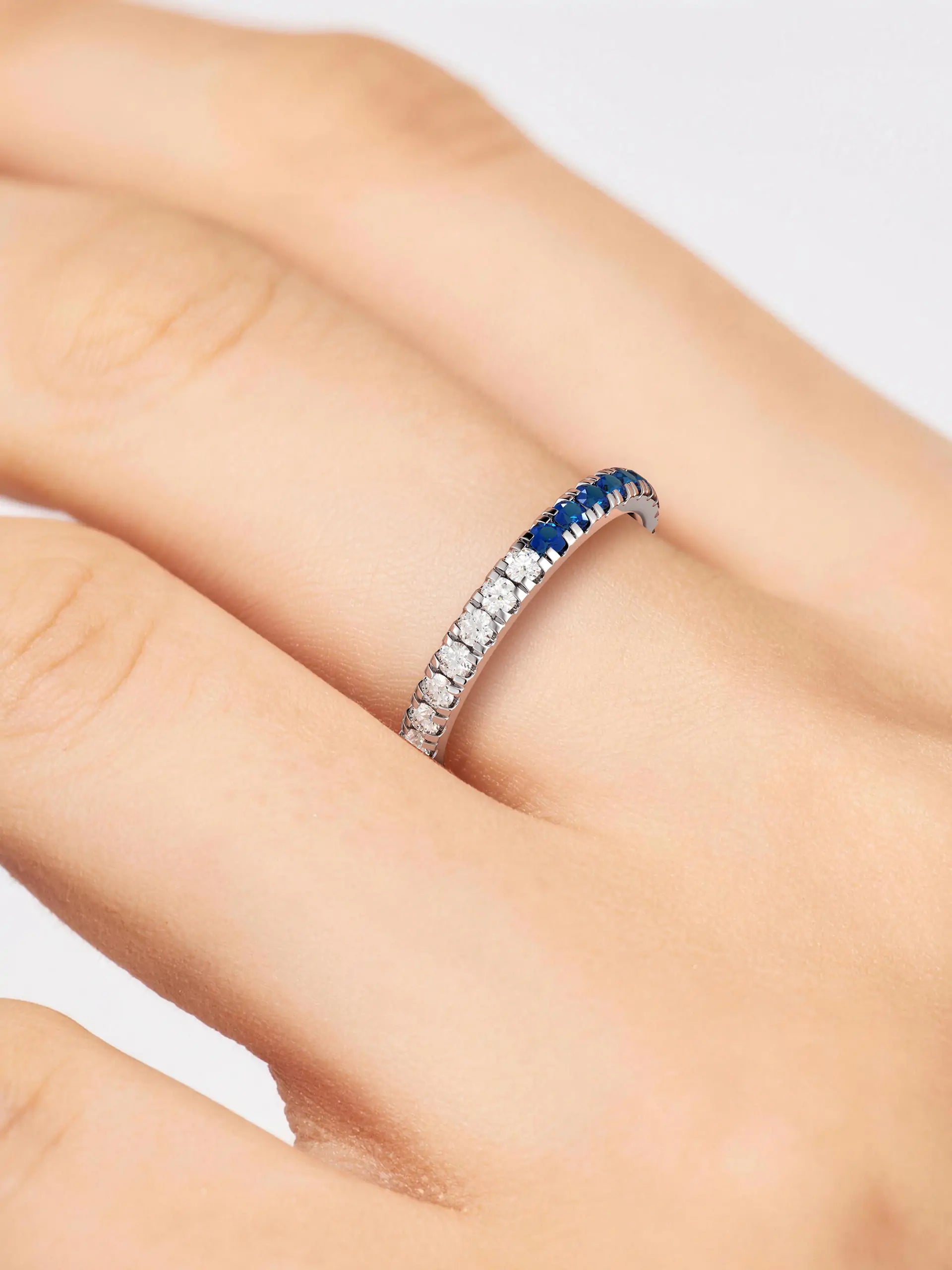Blue and white moissanite create bold contrast and sparkle. Designed for stacking or solo wear, lightweight and secure for everyday styling.