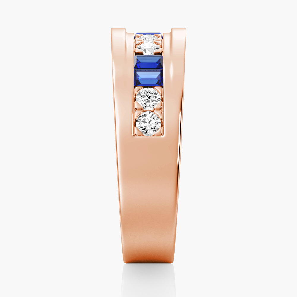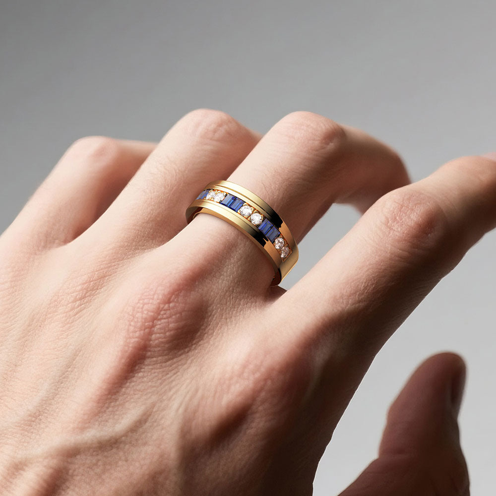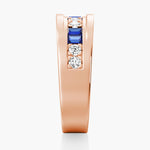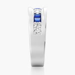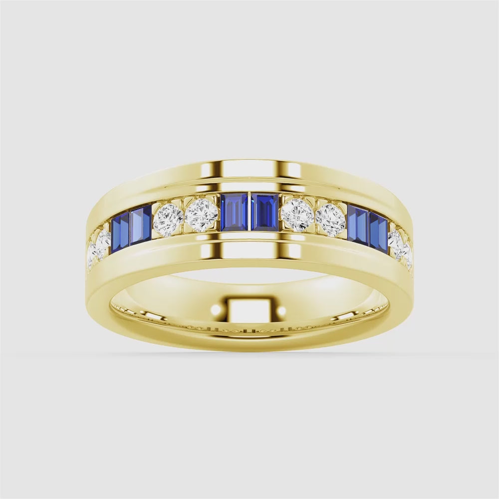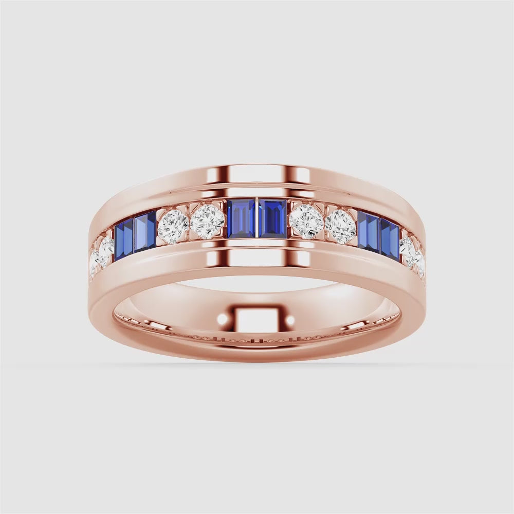 With its combination of vibrant sapphire gemstones and sparkling Moissanite stones, this band exudes opulence and sophistication. Available in a range of premium materials, including S925 Silver, 10K Gold, 14K Gold, or Platinum, and your choice of White, Yellow, or Rose Gold, you can personalize this band to reflect your unique style. Experience exceptional craftsmanship and timeless beauty with this remarkable men's wedding band, a symbol of enduring love and exquisite taste.