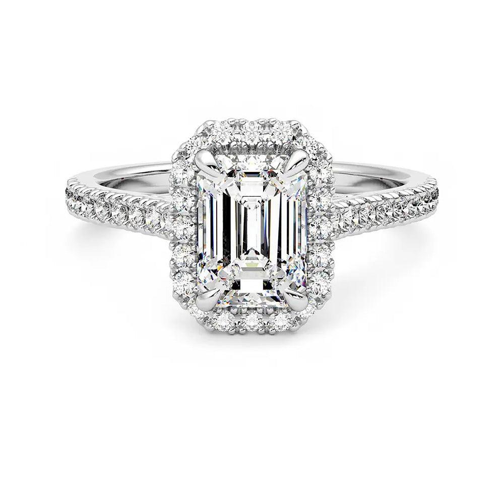 Emerald Cut Halo Moissanite Engagement Ring with Hidden Anniversary Stone Accent - MSBLUE Jewelry