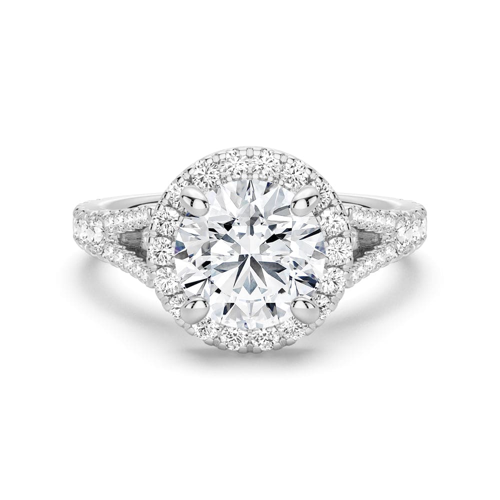 This exceptional setting features a halo of diamond accents that curves gently around the center gem for a distinctive look. Two rows of pavé diamonds sparkle on the contemporary split shank band, while a surprise row of diamond accents on the bridge completes this glamorous look.