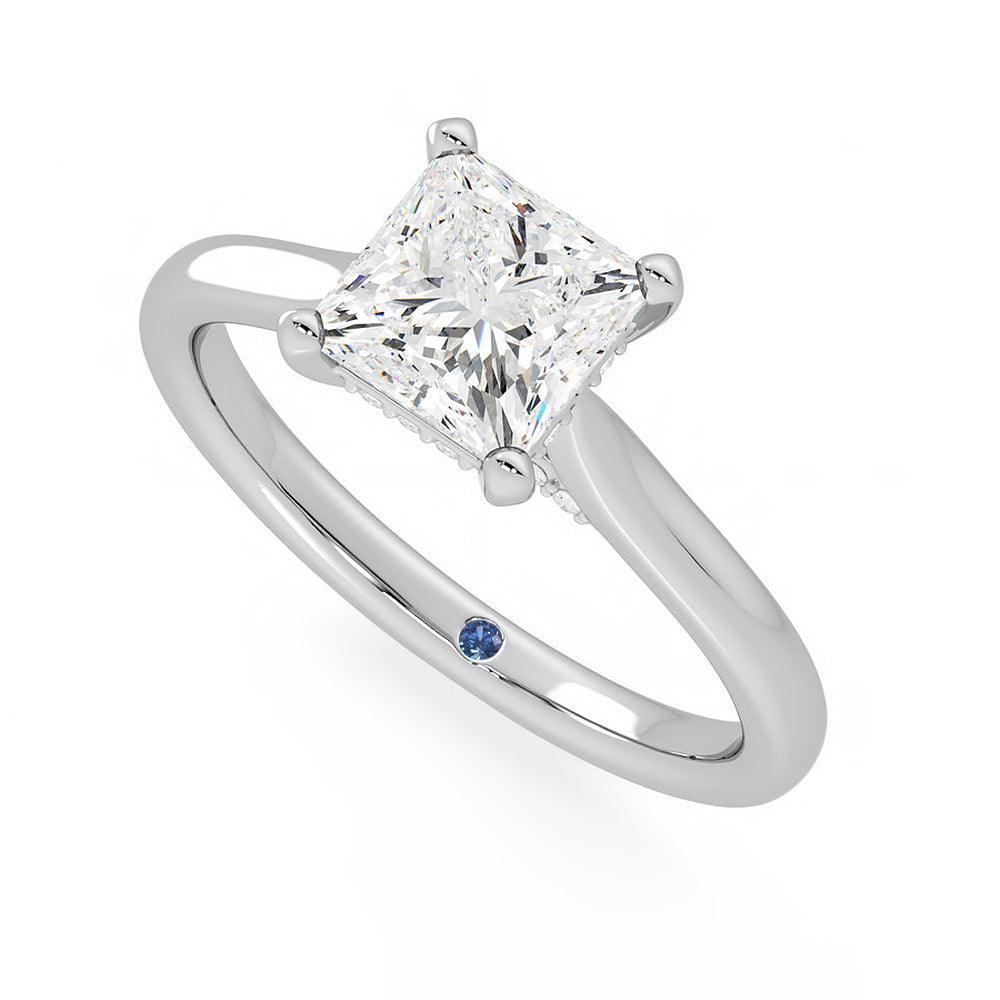 The stunning princess cut center stone captures the eye with its contemporary brilliance and geometric elegance. This modern design is complemented by subtle hidden accents, adding extra sparkle and sophistication that remains discreetly concealed until discovered.