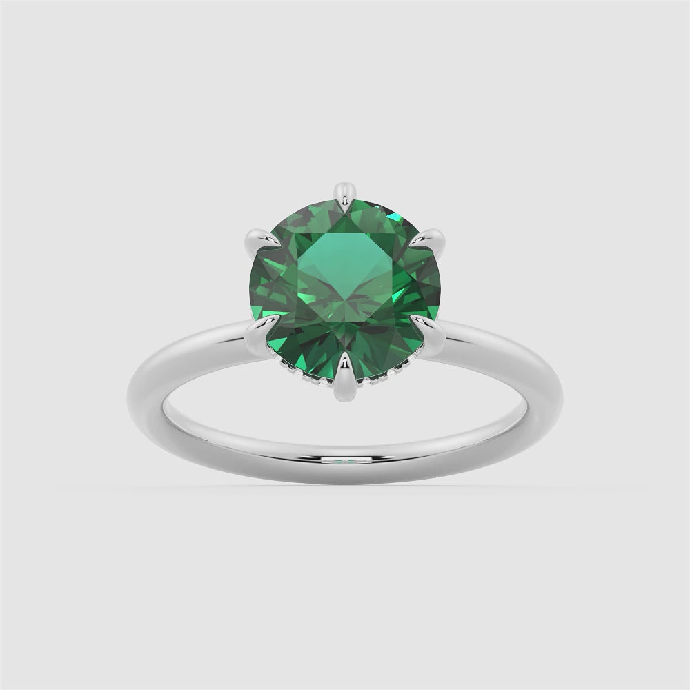 This six-prong solitaire is the ultimate classic engagement ring style. Crafted to showcase your choice of green moissanite gemstone, petite six claw prongs secure and support the center stone. The slender silhouette and polished finish of this solitaire exemplify timeless design, proving simple can be truly stunning.