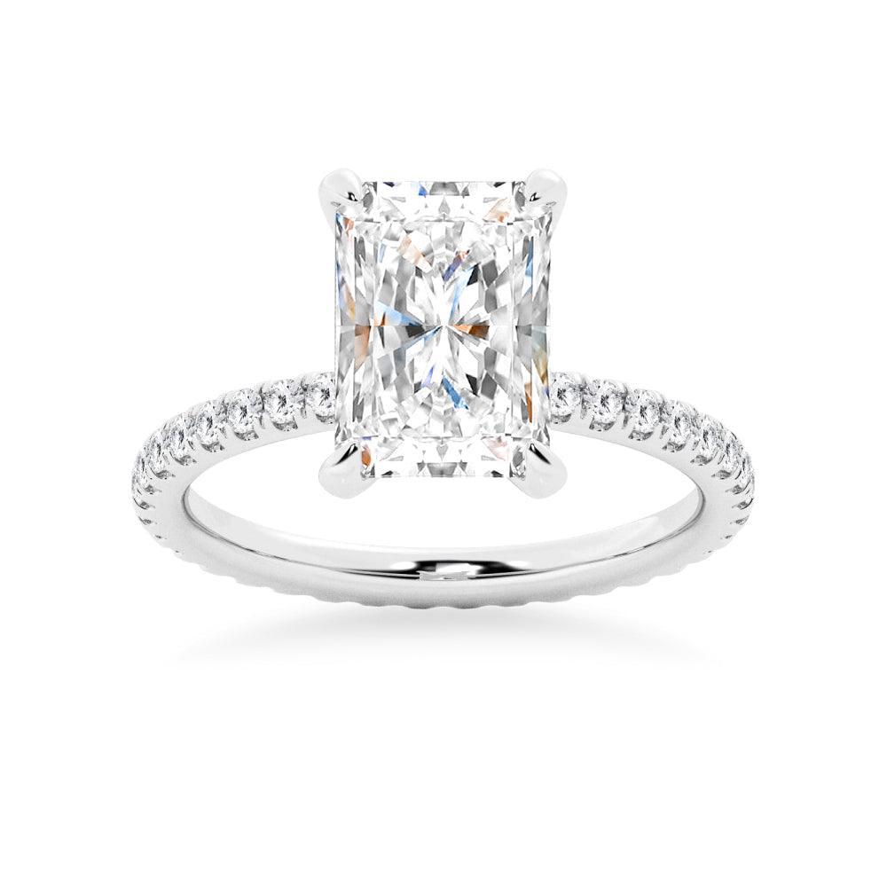 Introducing our breathtaking Radiant Cut Moissanite Engagement Ring with Eternity Pave Band, a perfect representation of love and commitment. This stunning ring features a radiant cut moissanite center stone that's beautifully crafted to showcase its unique and captivating sparkle.
