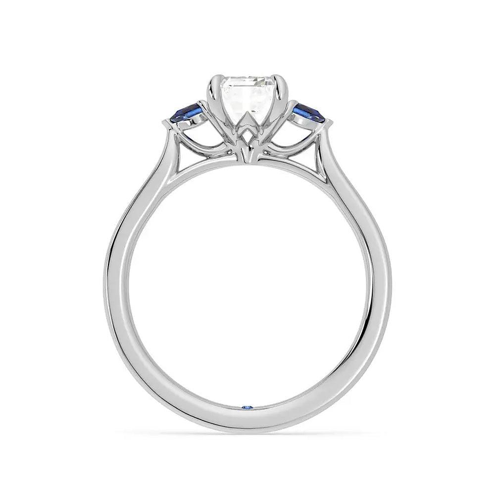 The central emerald cut moissanite takes center stage, flanked by two additional pear cut stones on each side, creating a harmonious and elegant arrangement that symbolizes your past, present, and future together.
