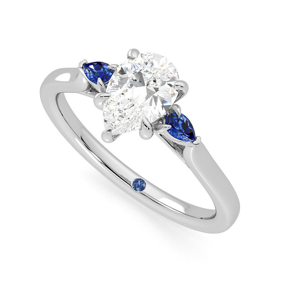 The central princess cut moissanite takes center stage, flanked by two additional pear cut stones on each side, creating a harmonious and elegant arrangement that symbolizes your past, present, and future together.