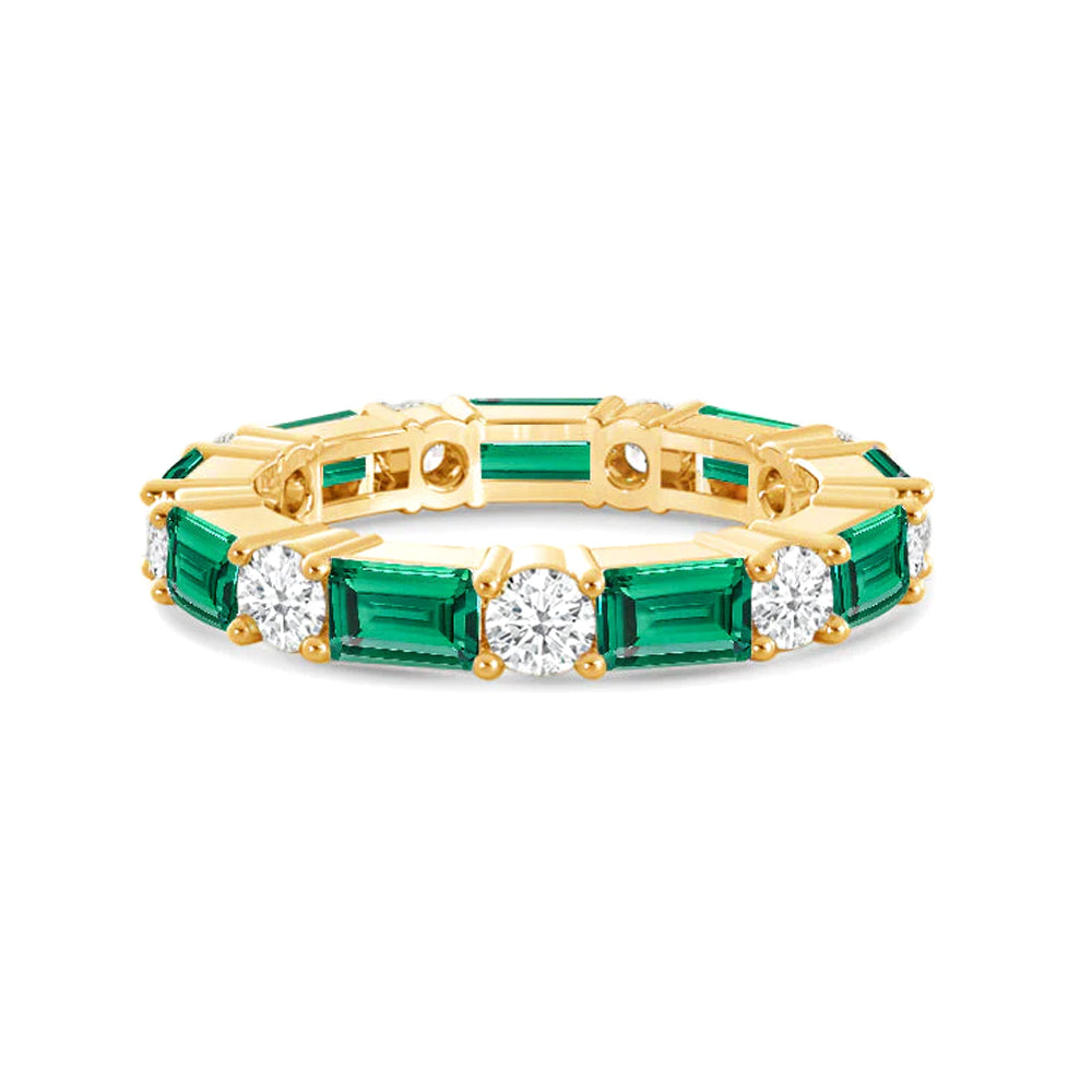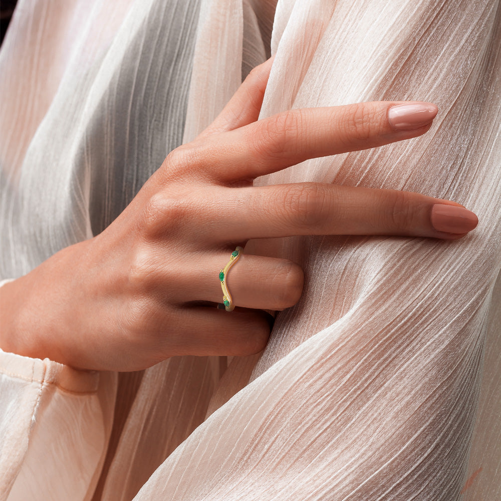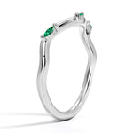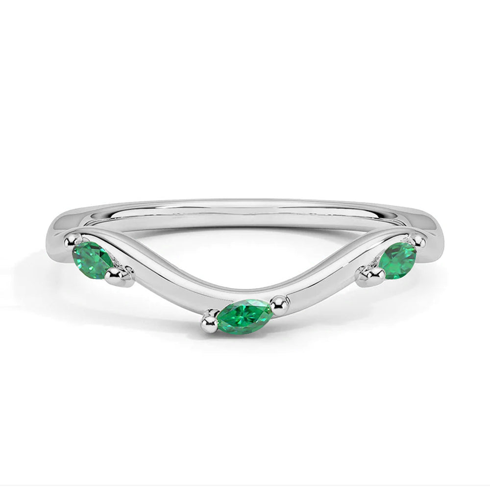 The Willow Curved Lab Grown Emerald Band is an elegant and sophisticated piece, designed to captivate with its refined simplicity. This ring features a gently curved shape, set with dazzling lab grown emeralds that bring a deep, rich color to the piece.