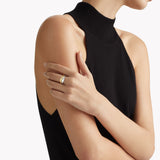 Crafted in rhodium-plated 925 silver and 18k gold vermeil, the piece merges architectural stability with featherlight ergonomics. Diamond claws are recessed for snag-free wear, while the curvilinear form nestles perfectly against solitaire bands.