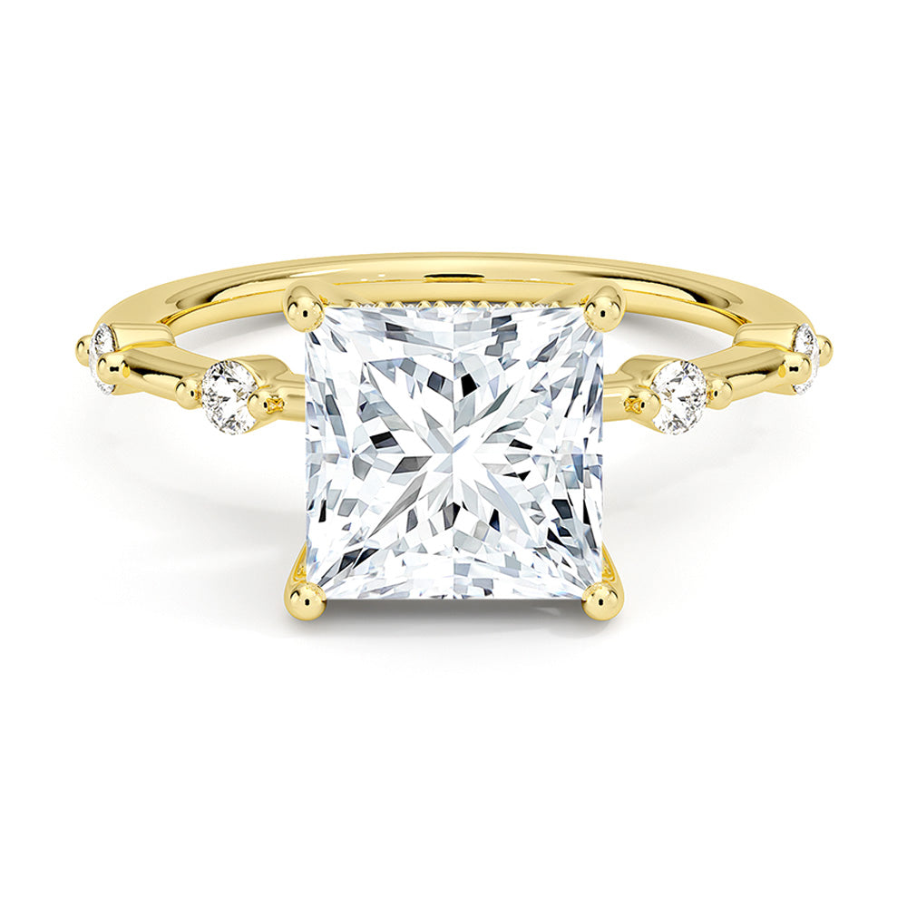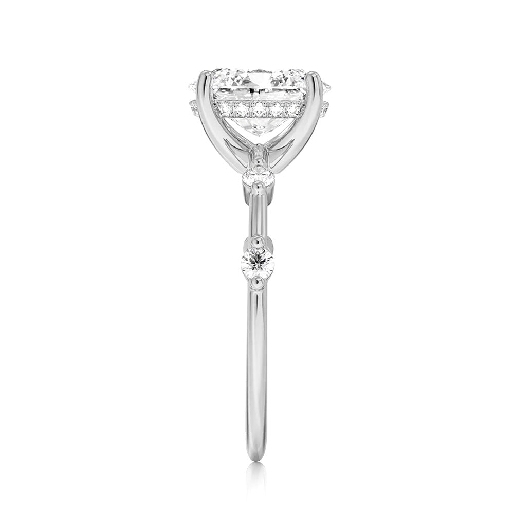 Known for its extraordinary brilliance and ethical appeal, Moissanite offers a dazzling alternative to diamonds. The hidden halo provides a subtle yet stunning glow, while the spaced diamonds on the band add extra sparkle and refinement. This ring is the perfect symbol of enduring love and commitment.