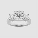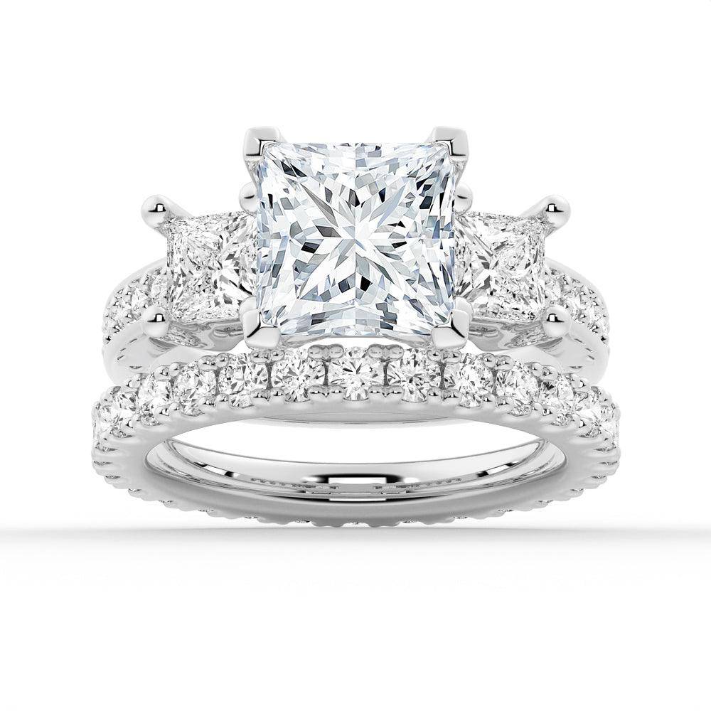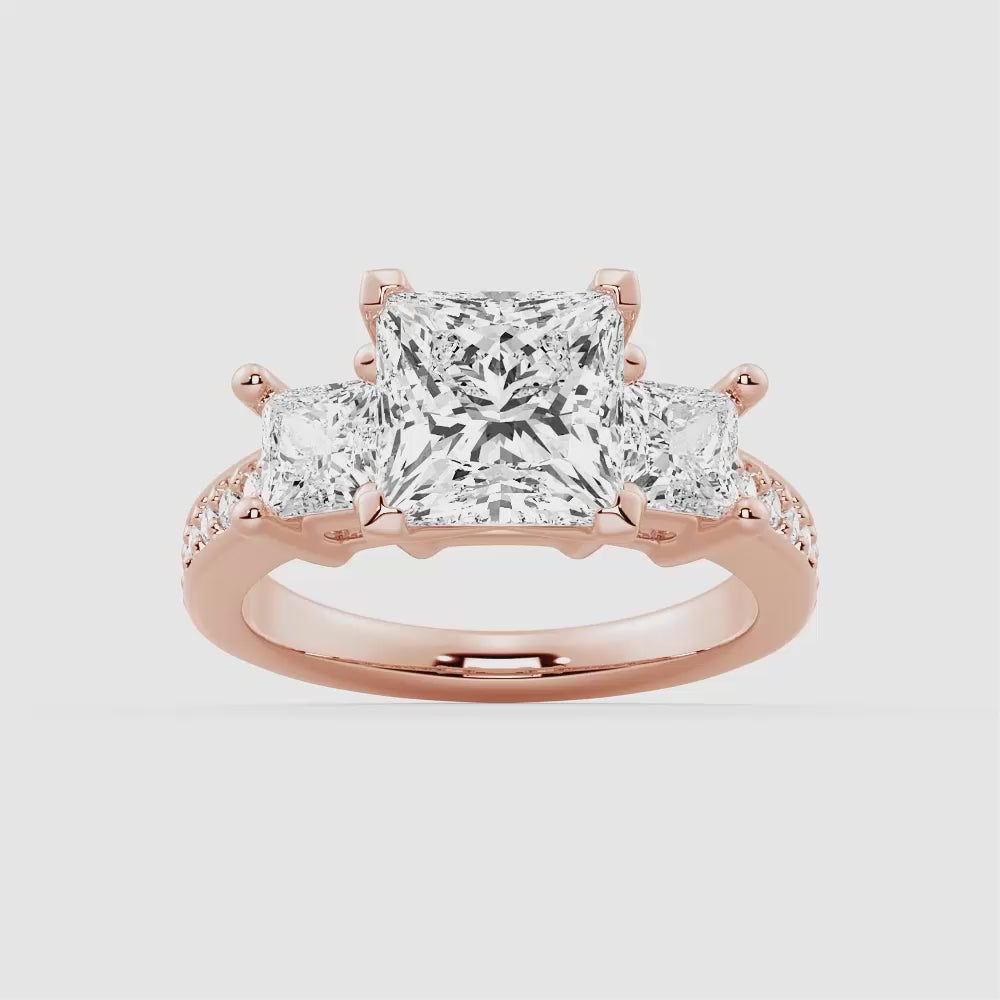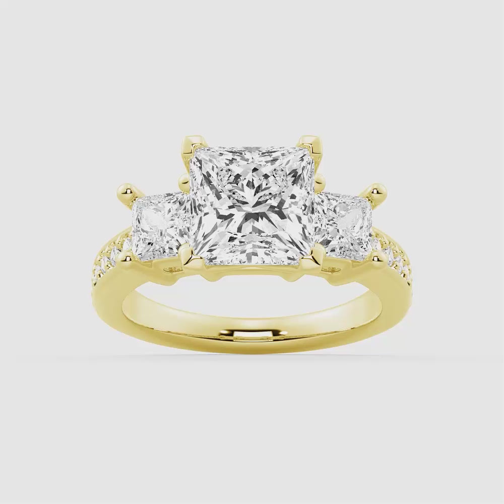 This timeless piece features a central princess-cut diamond, exuding regal brilliance and modern sophistication. Flanking the center stone are two equally stunning princess-cut diamonds, symbolizing the past, present, and future of your unique love story. Set in a secure and elegant arrangement, the three stones harmonize to create a captivating visual representation of your enduring commitment.