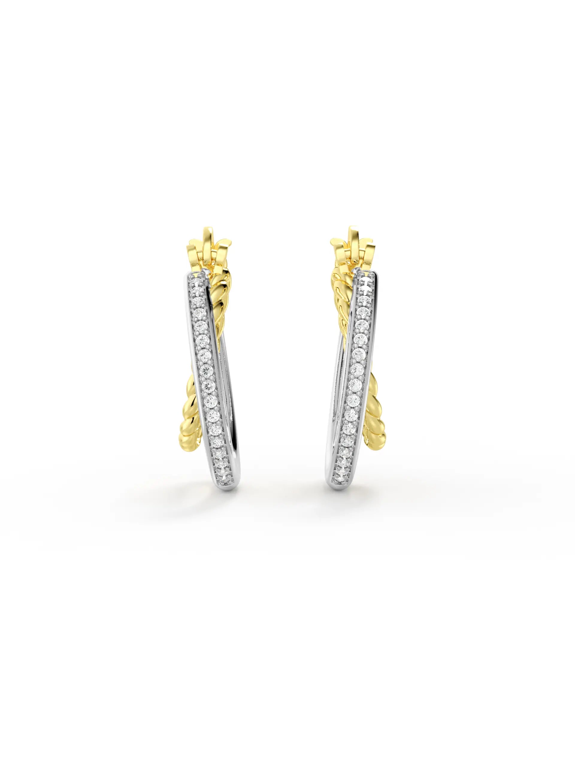 Interwoven double hoops in mixed metal tones with textured detailing and luminous edges. A modern take on vintage-inspired style.
