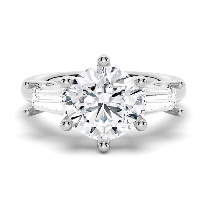 This iconic ring features two tapered baguette-cut side stones, brilliantly framing the center cushion-cut moissanite diamond set in double-claw prongs. This ring offers a petite silhouette with timeless style. Available from 1 carat to 3 carat. For more carat options please Contact our Customer Service: service@msblue.com