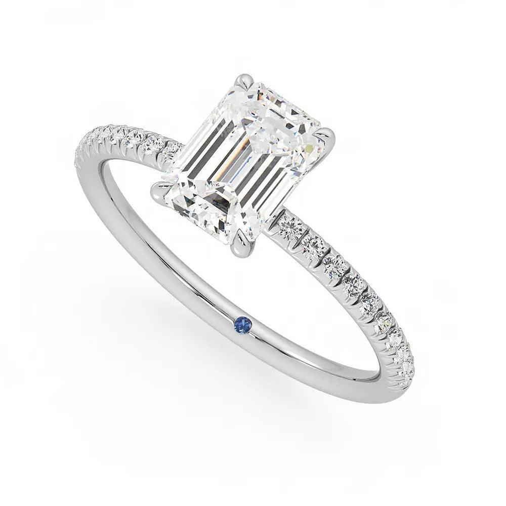 Four Prong Emerald Cut Moissanite Engagement Ring with Hidden Anniversary Stone Accent