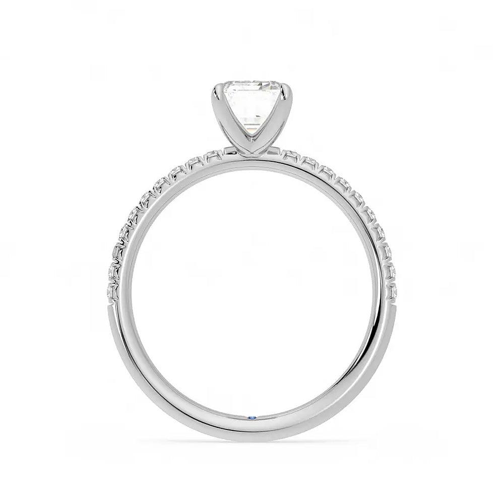 The centerpiece is a stunning emerald cut moissanite, held securely by a classic four-prong setting that highlights its sophisticated facets and brilliant sparkle.