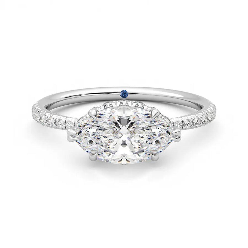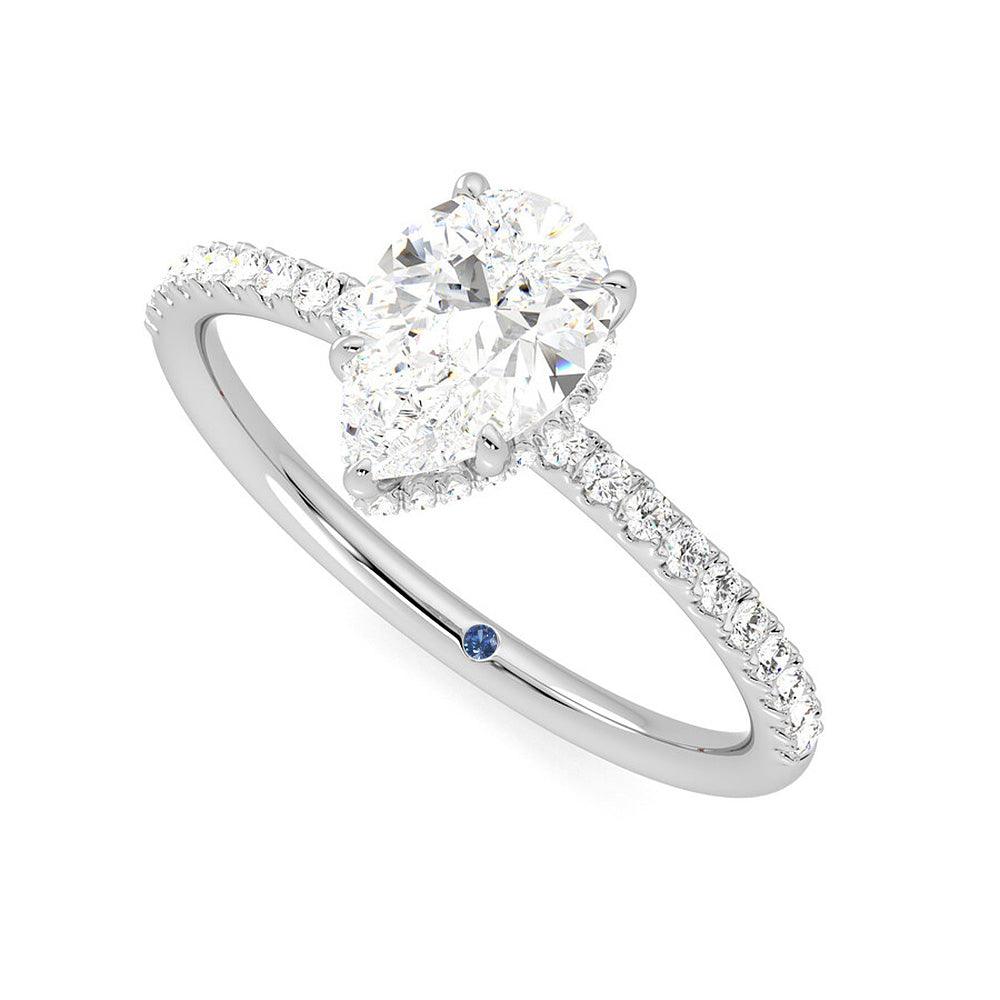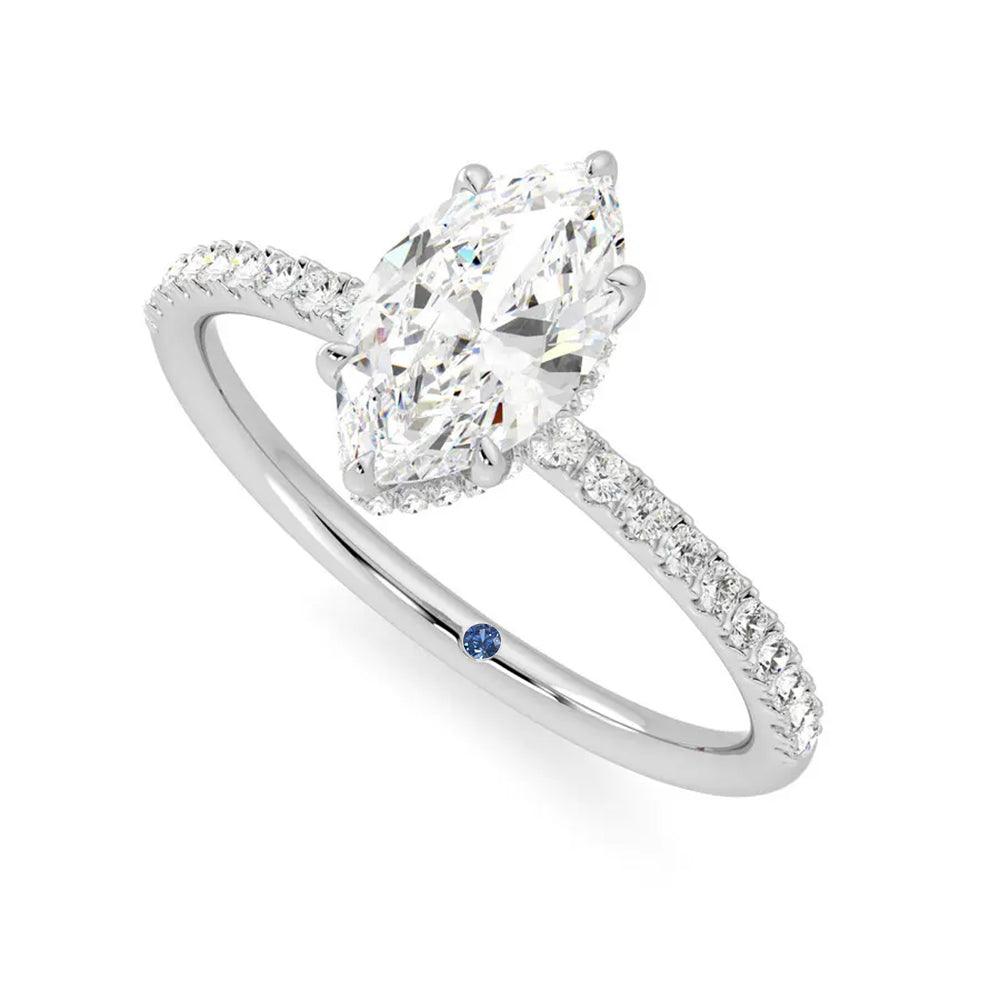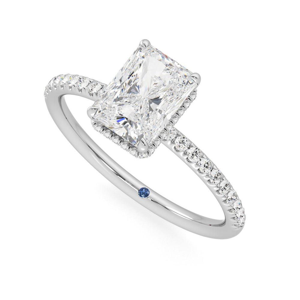 Surrounding the main stone is a hidden halo of delicately set gemstones, subtly enhancing the ring's radiance and adding a touch of surprise visible only upon closer inspection.