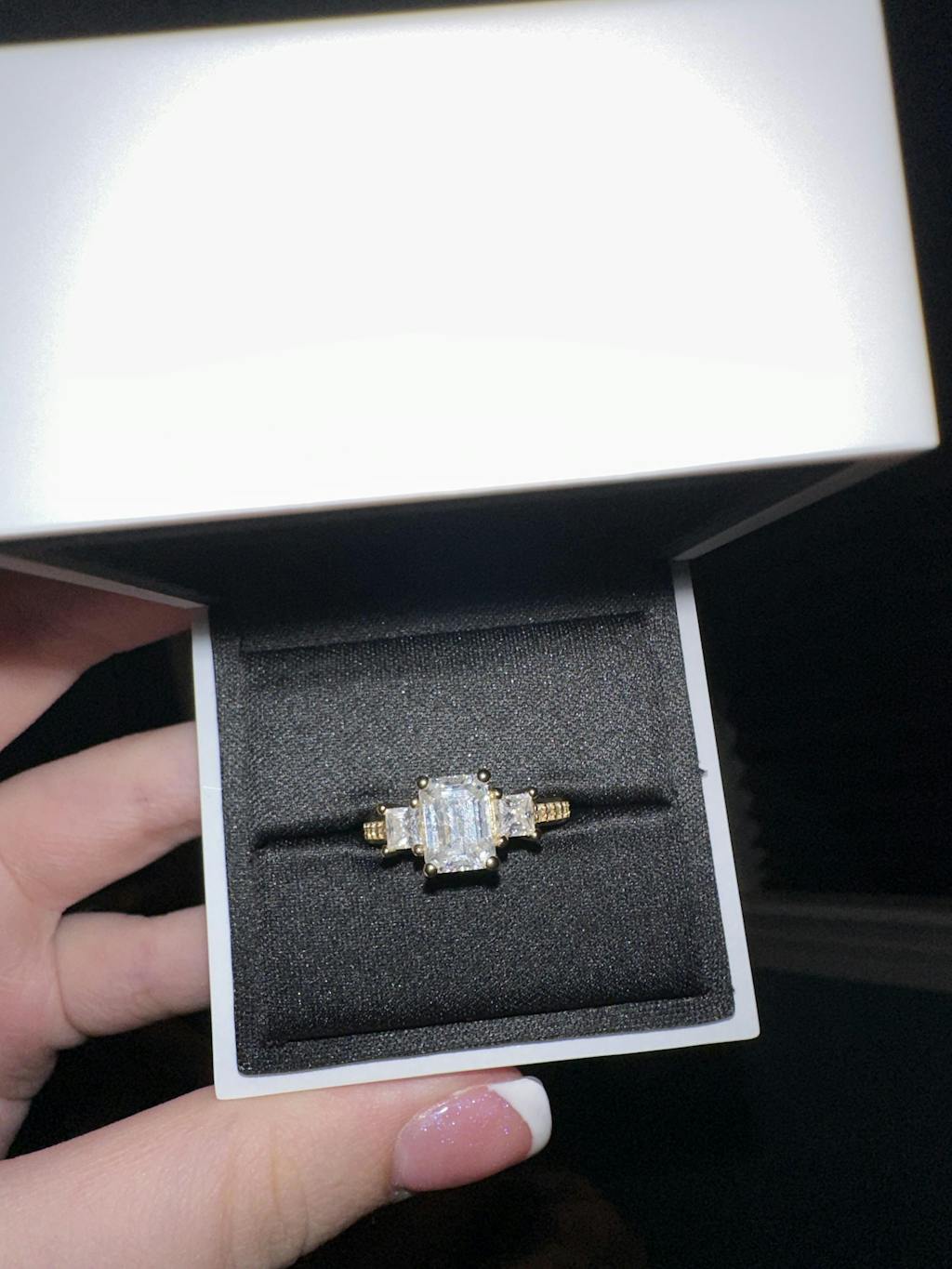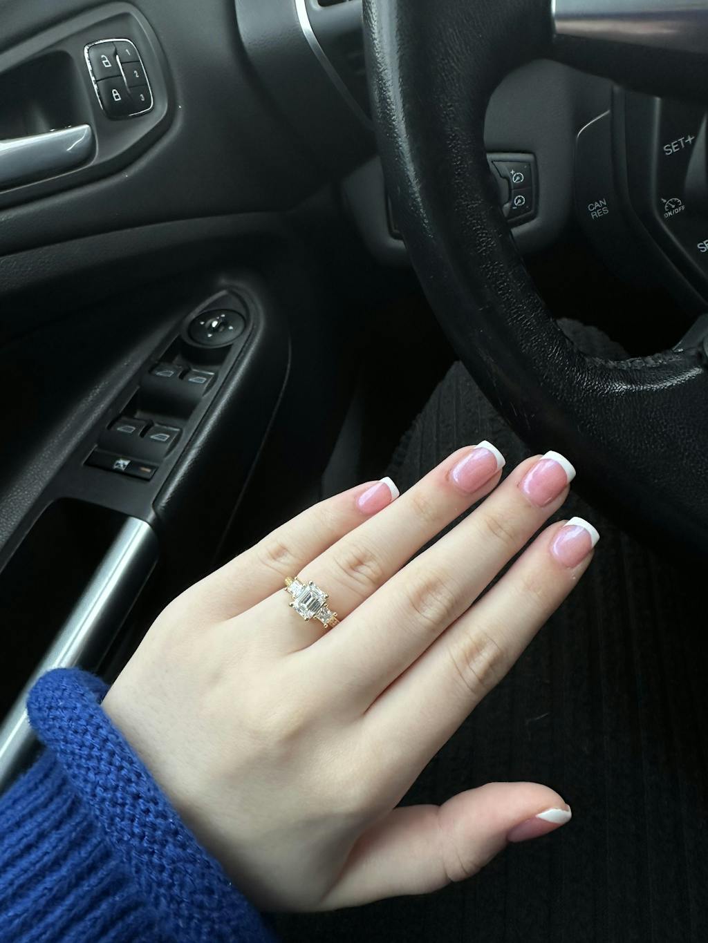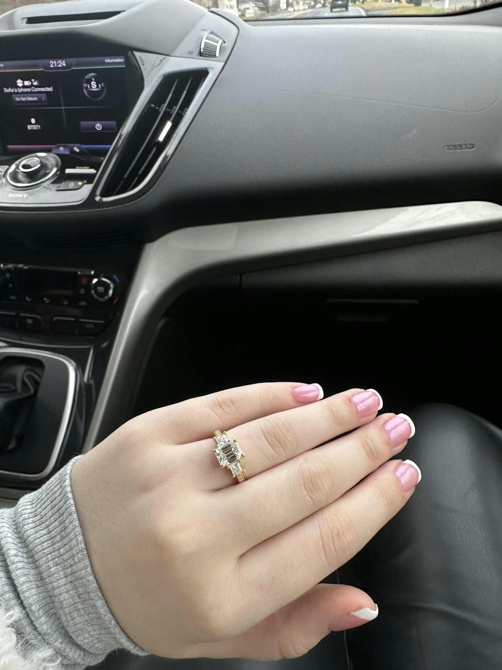 The emerald cut center stone with two tapered side stones creates such a sophisticated look. The step cuts give it amazing depth and clarity,it catches light differently than round brilliants.