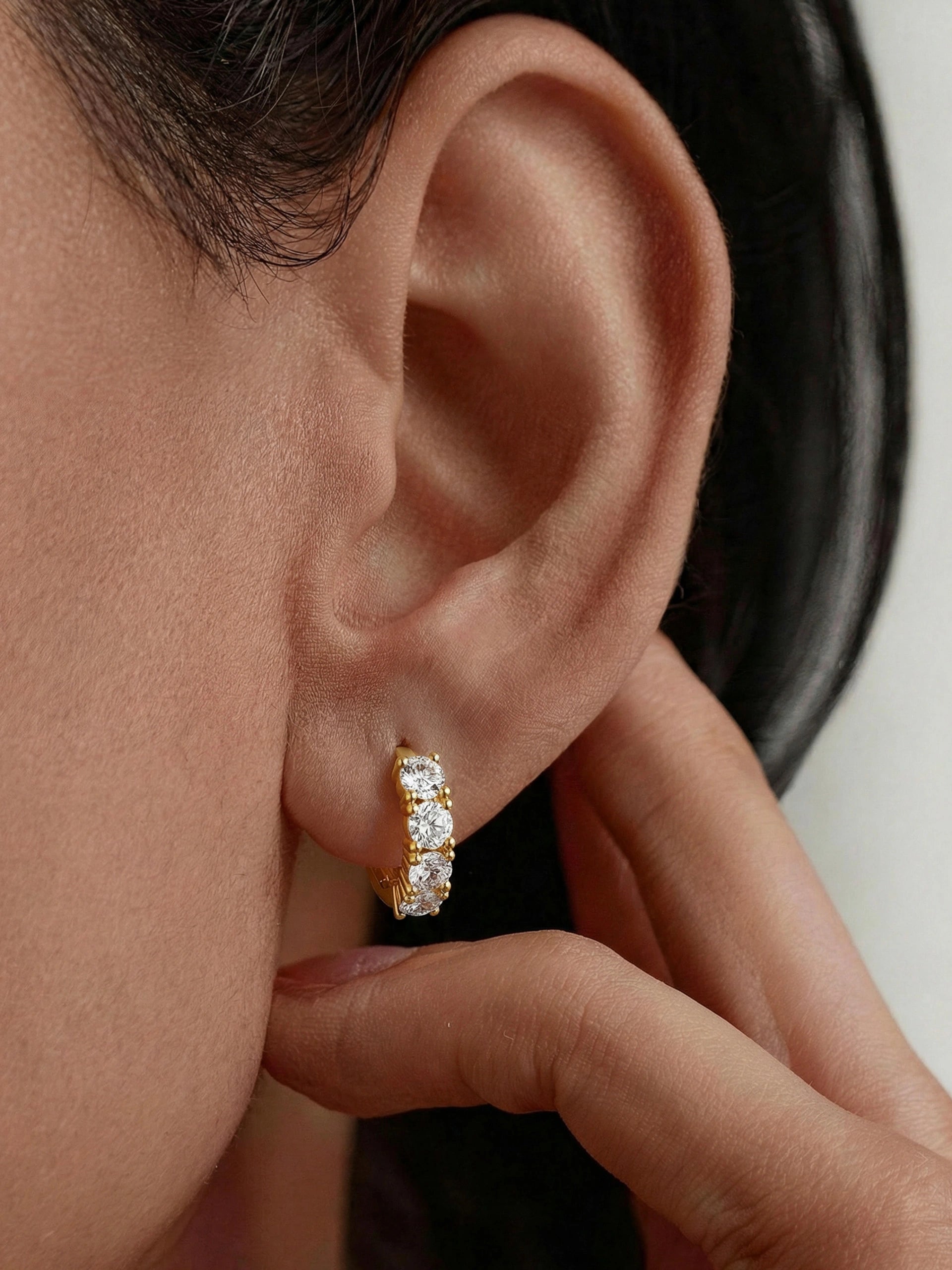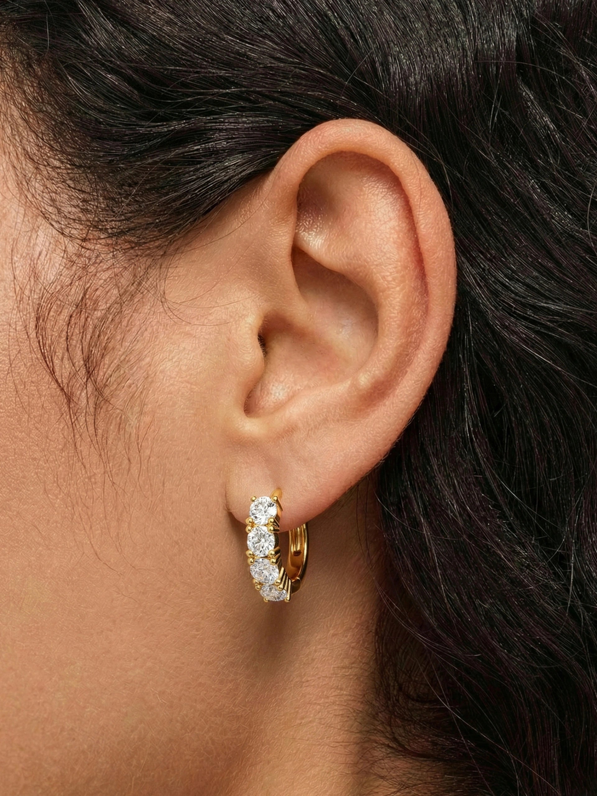 These huggie hoops feature a half - eternity design, lined with sparkling moissanite stones that curve gracefully around the ear. The continuous yet understated shimmer adds a touch of timeless elegance, perfect for elevating everyday looks or complementing special - occasion attire. Crafted for comfort and style, they blend classic romance with modern sparkle.