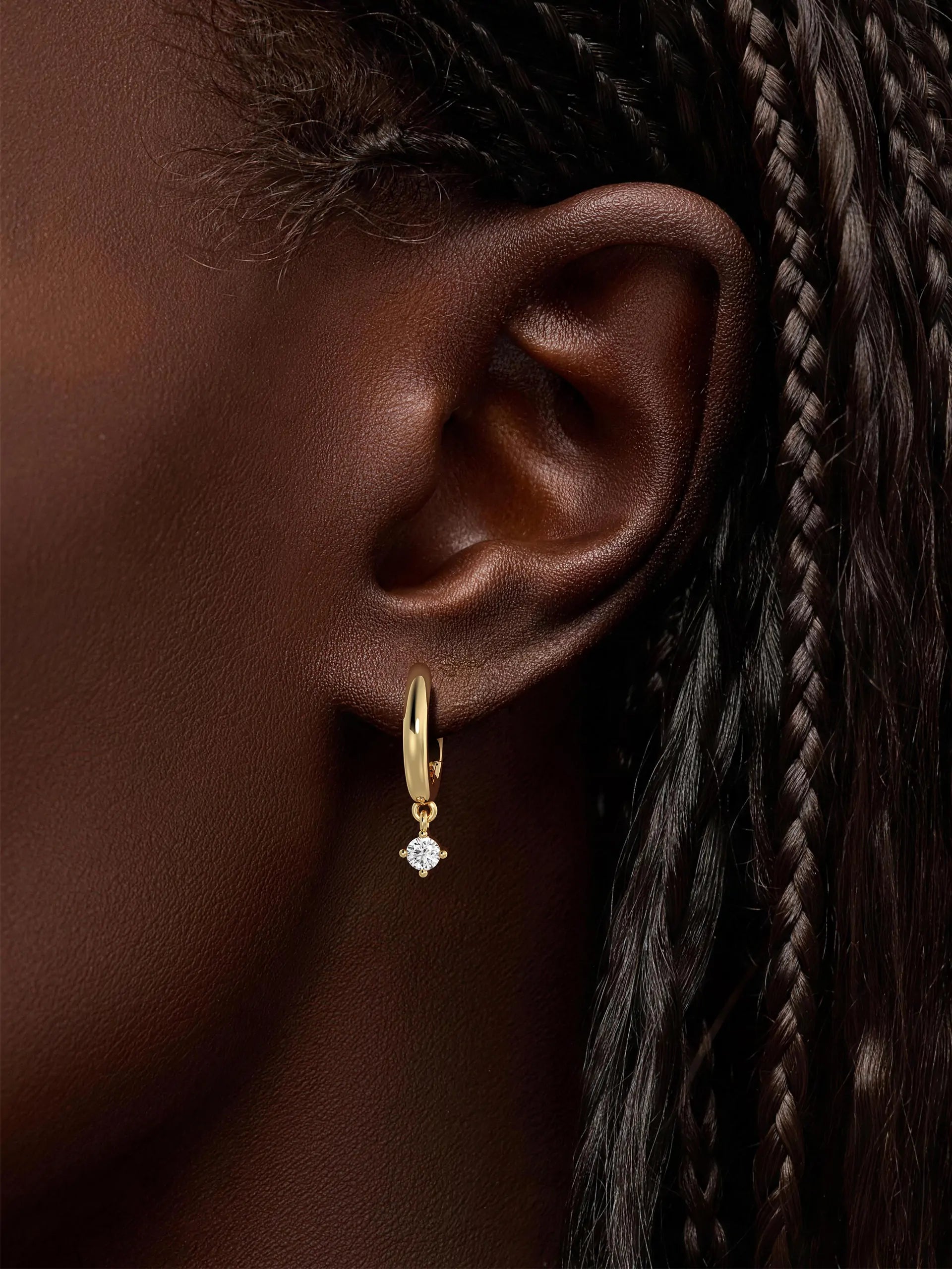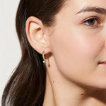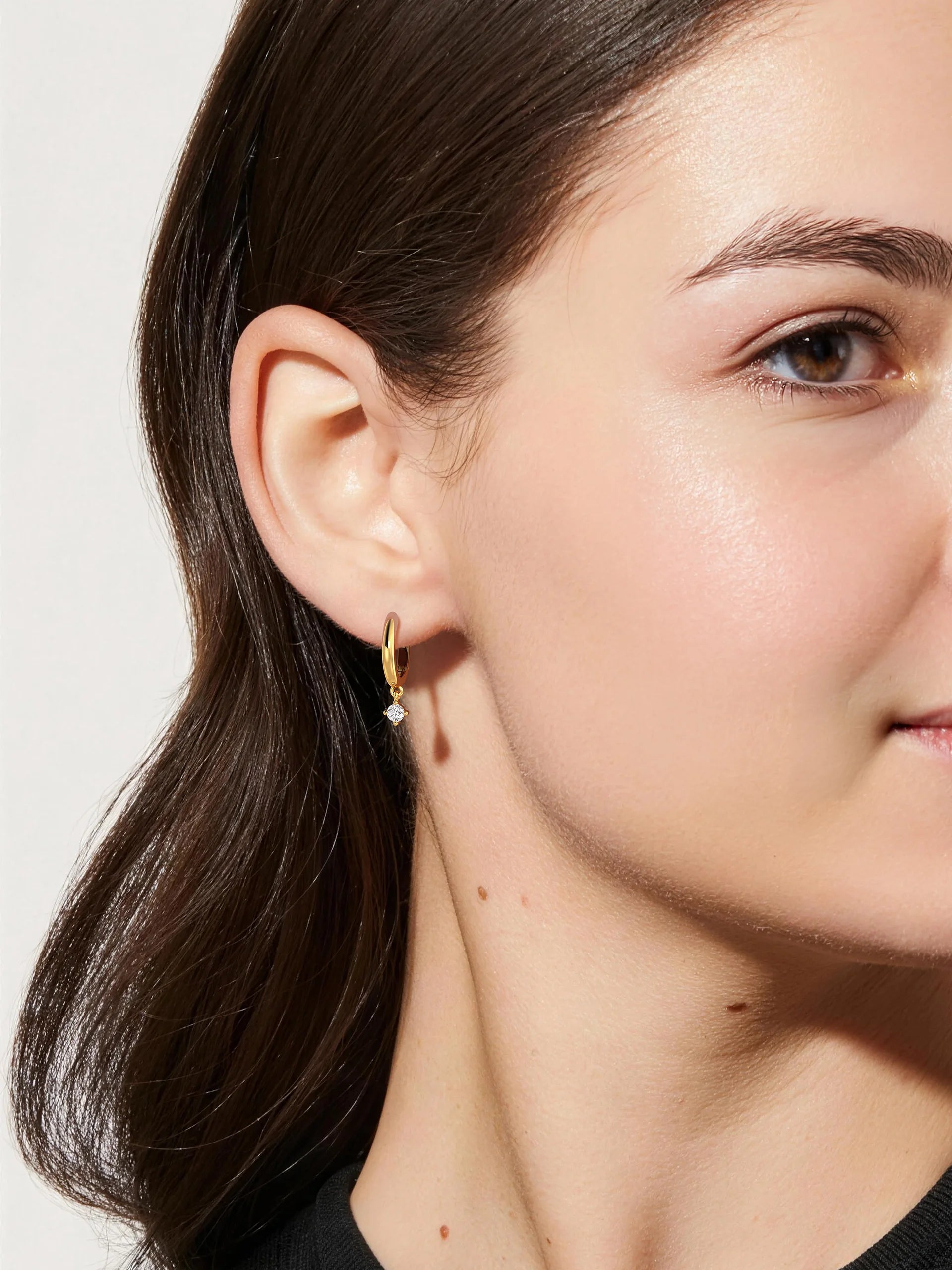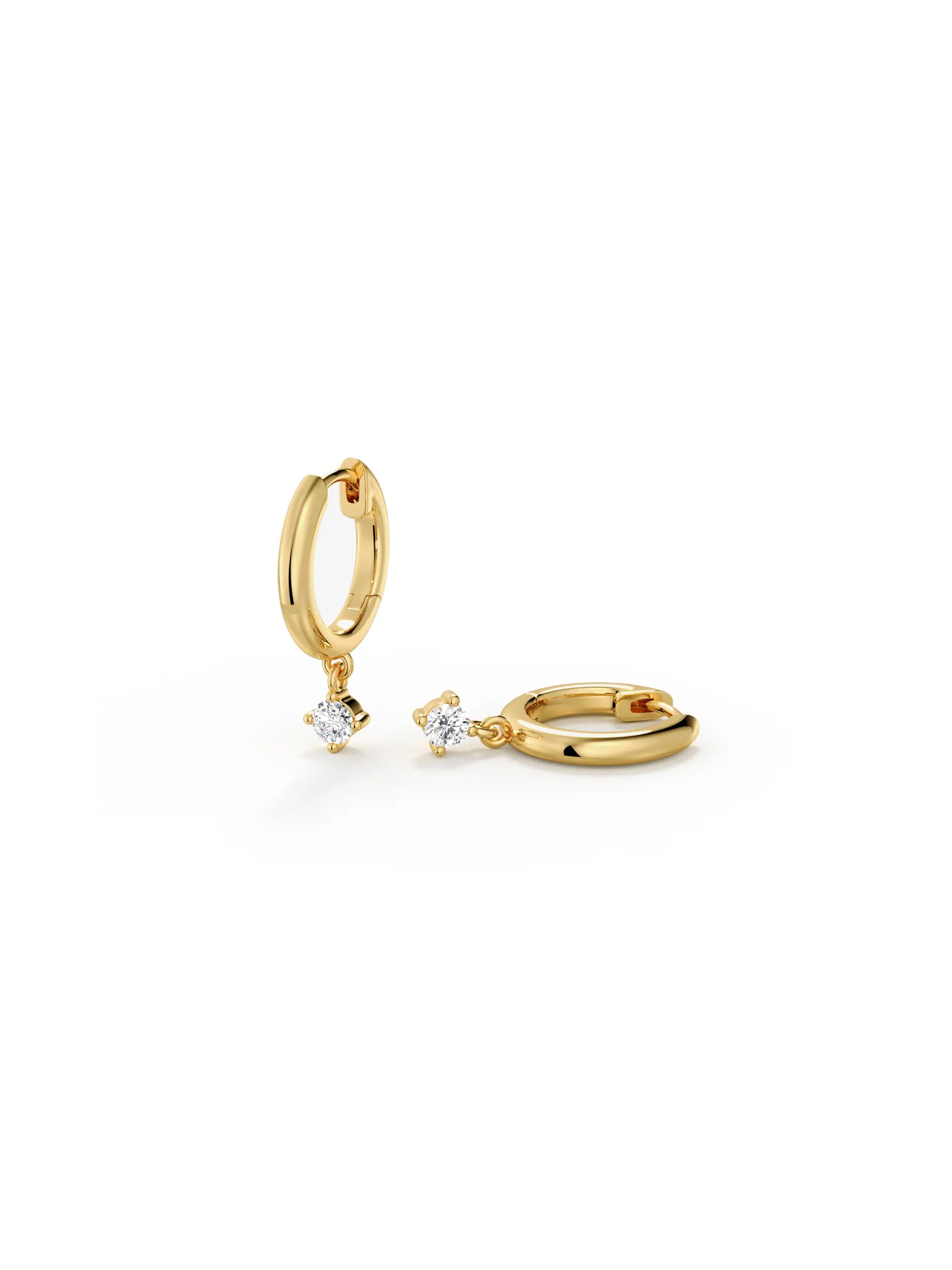 Polished gold huggie hoops dangle single, sparkling solitaire stones. The minimalist yet elegant design blends everyday wearability with a touch of luxury. Perfect for adding subtle shimmer to casual looks or elevating evening outfits—these earrings offer effortless sophistication in every drop.