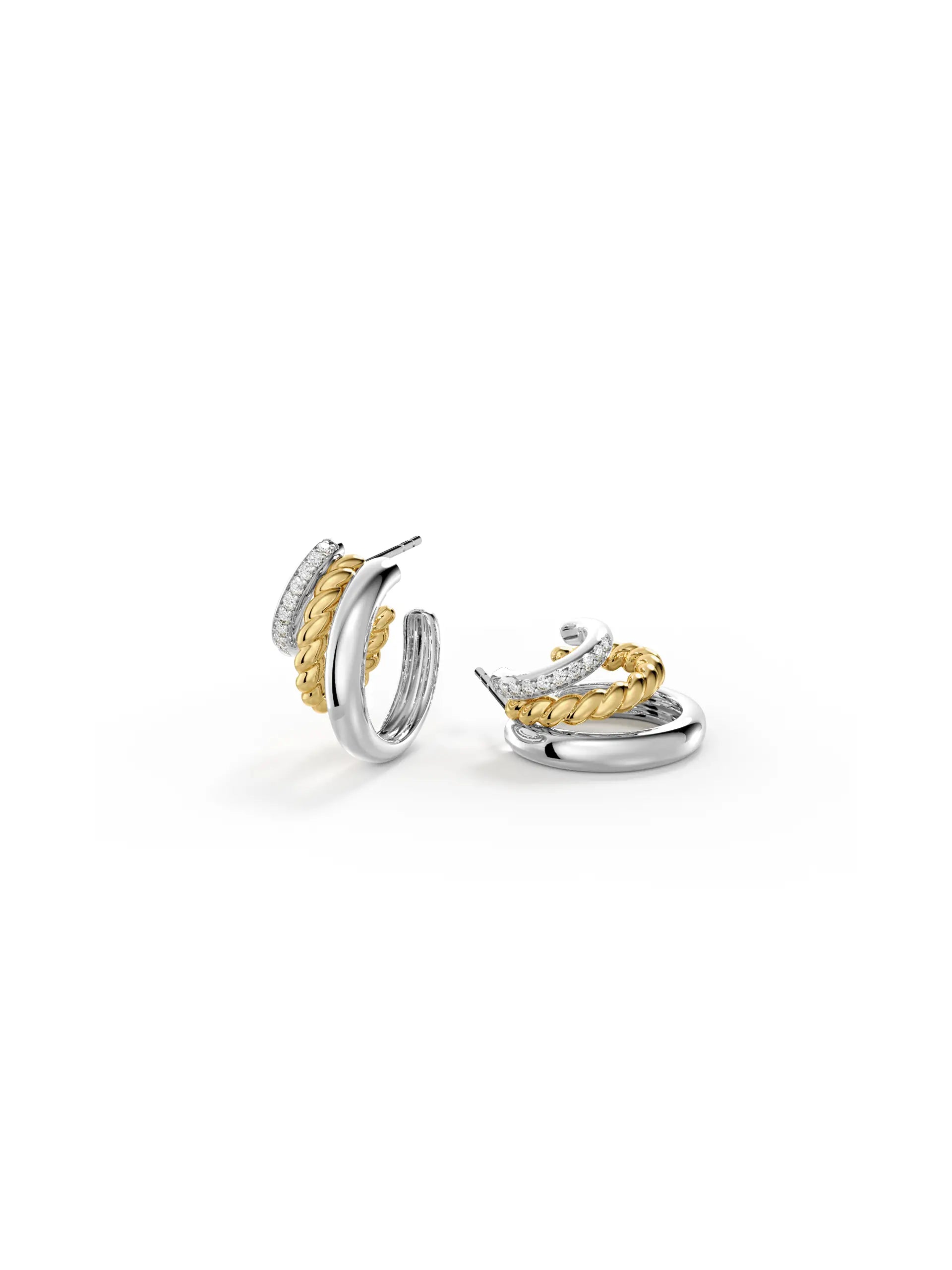 Three interlocking loops in mixed metal tones with refined sparkle edging. Bold yet balanced, perfect for elevated daily styling.